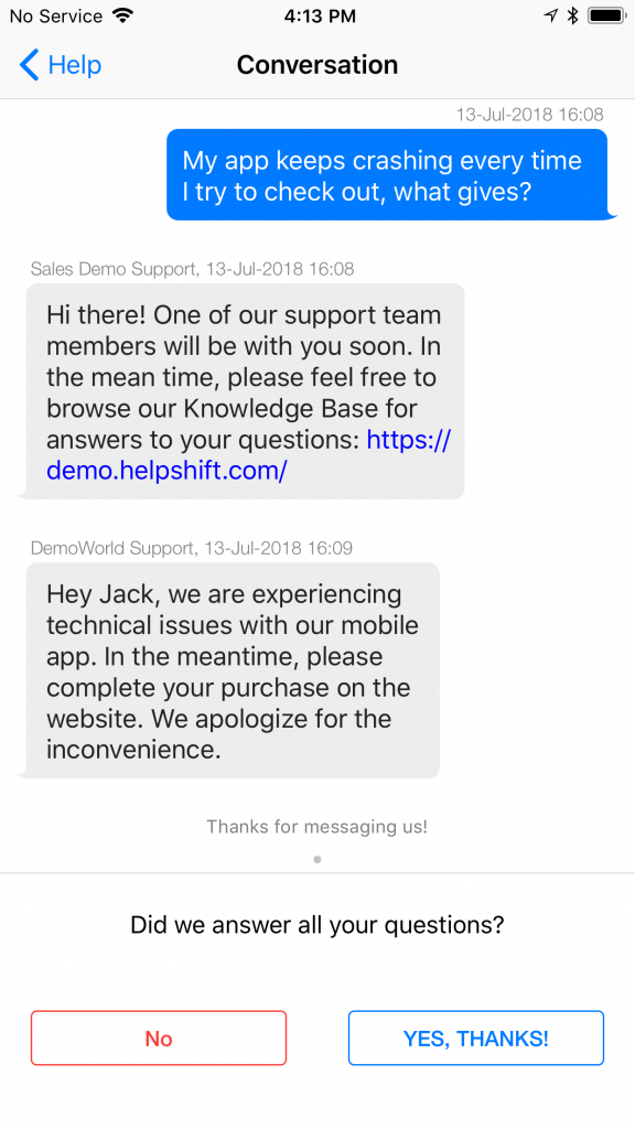 - The follow-up message will appear as an in-app notification in Legacy SDK and as a push notification in SDK X. If the user is within the app, it will appear as a new message from the Agent. If the user is outside the app, the Issue will remain closed until the user opens the app and sees the new message.