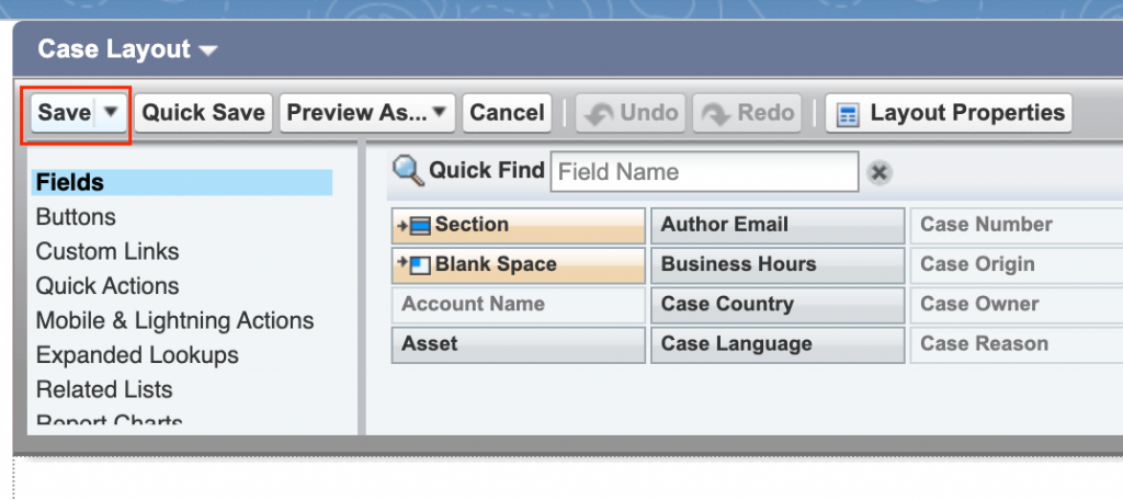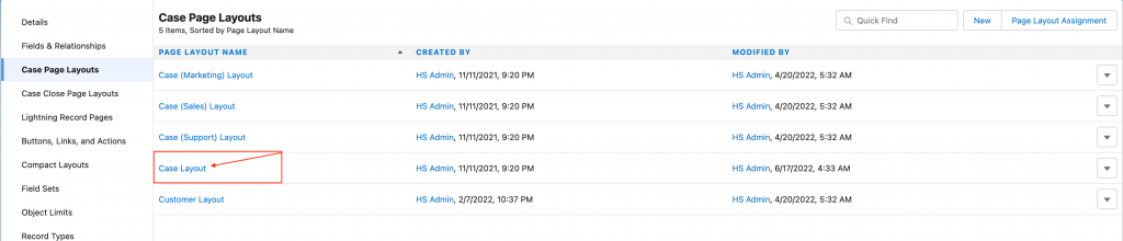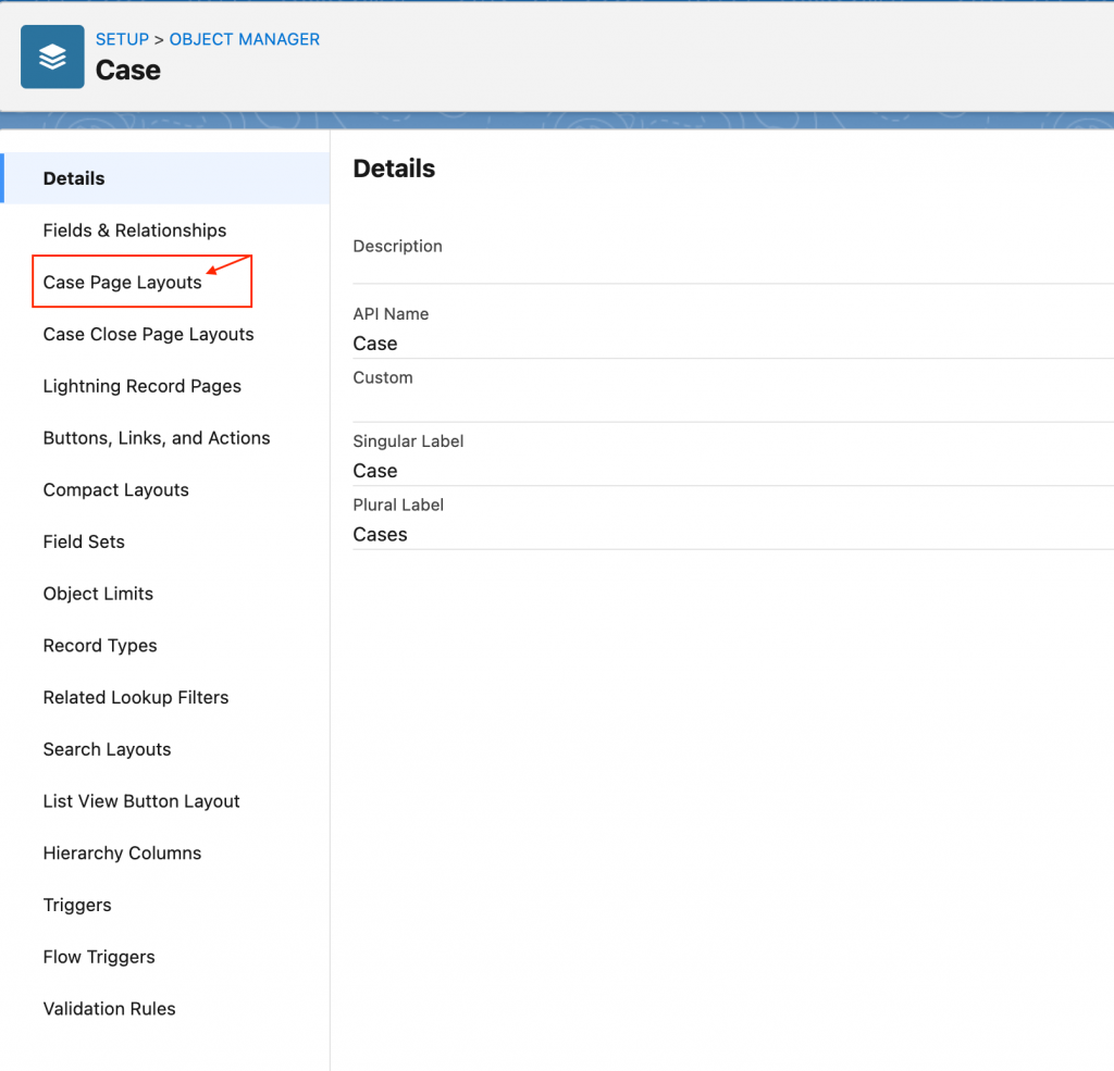 Select ‘Case Layout’ to add Helpshift app-related fields and related objects.