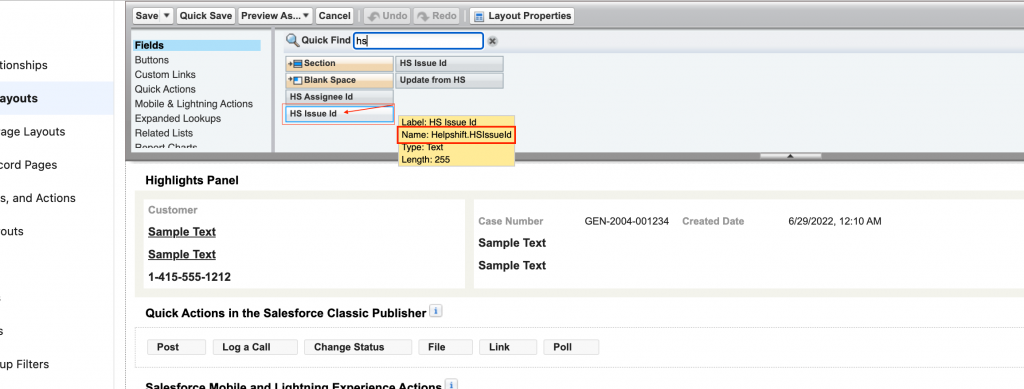 Add the ‘HS Issue Id’ field to the layout by dragging it to the desired position, and make sure the Name of the field is ‘Helpshift.HSIssueId’ same as below.