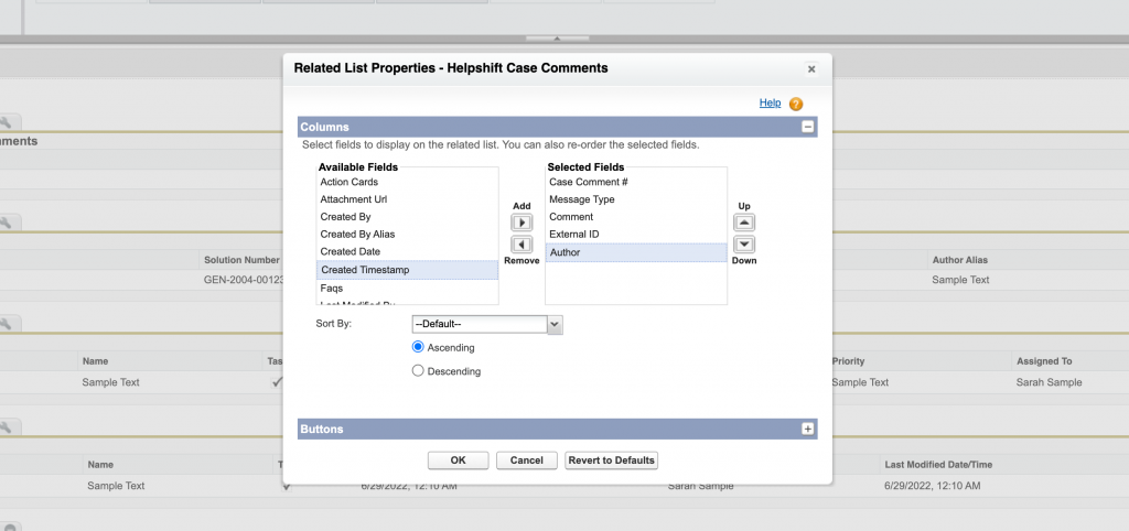 A pop-up will appear where you can modify the available fields. At least add ‘Message Type, Comment, External ID, and Author’ in the Selected Fields section and click ‘OK’.