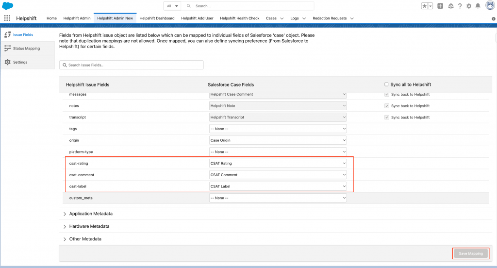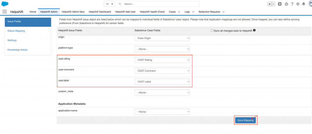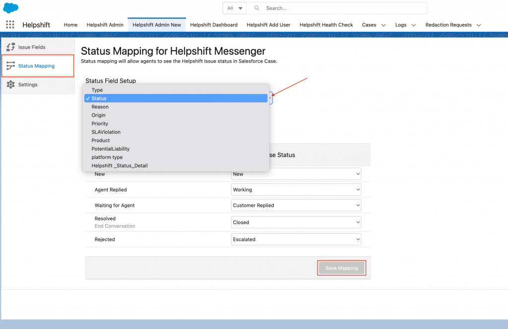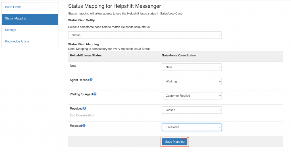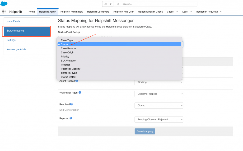 In the status mapping section, select the field which will be mapped with Helpshift’s Issue status. All the picklist fields are available, choose based on your processes and hit the Save Mapping button.