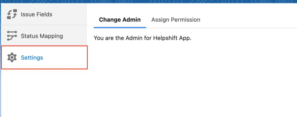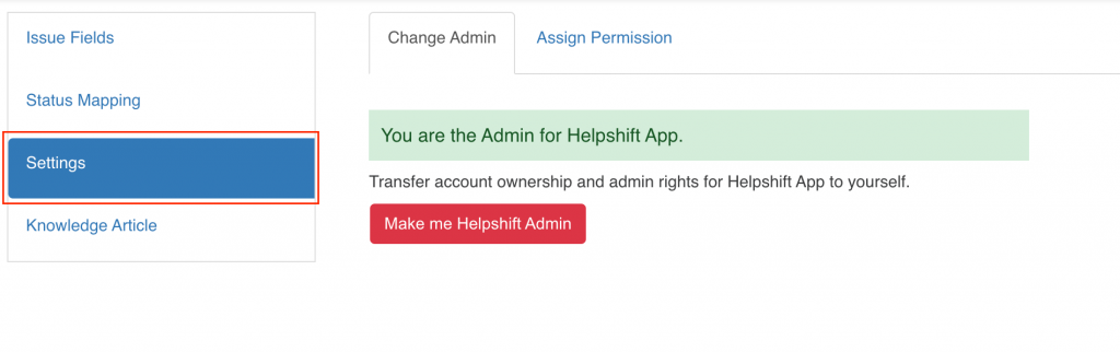 For configuring Helpshift Admin Use the ‘Change Admin’ tab from the ‘Settings’ section. Also, required permissions can be assigned to the agents using a single click through the Assign Permission tab.