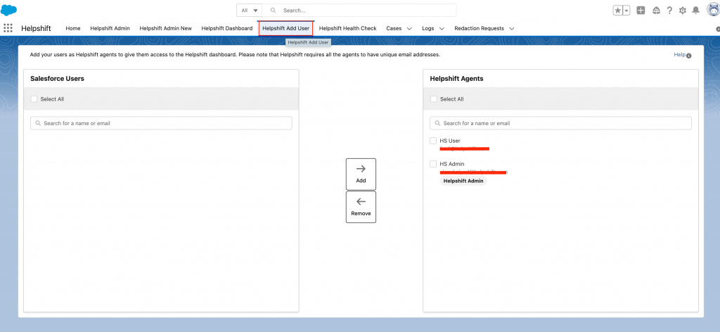Click on the ‘Helpshift Add User’ tab to add them as Helpshift Agents, this will automatically assign permissions to the Salesforce Users.