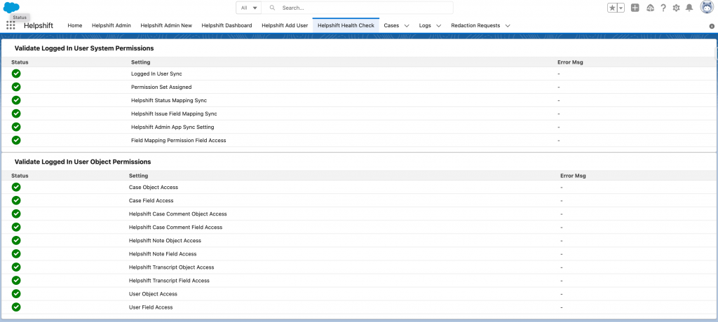 Click on the ‘Helpshift Health Check’ tab to check that the permissions and configurations are correct.