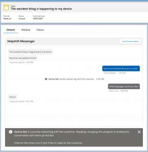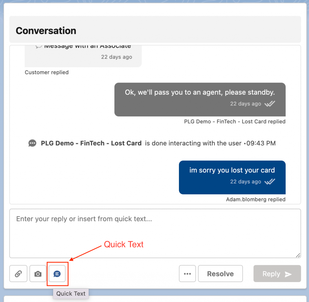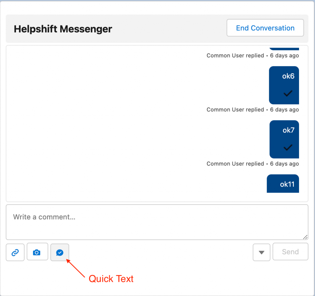 Agents can add Quick Texts created in Salesforce to Helpshift issues in the Messenger.