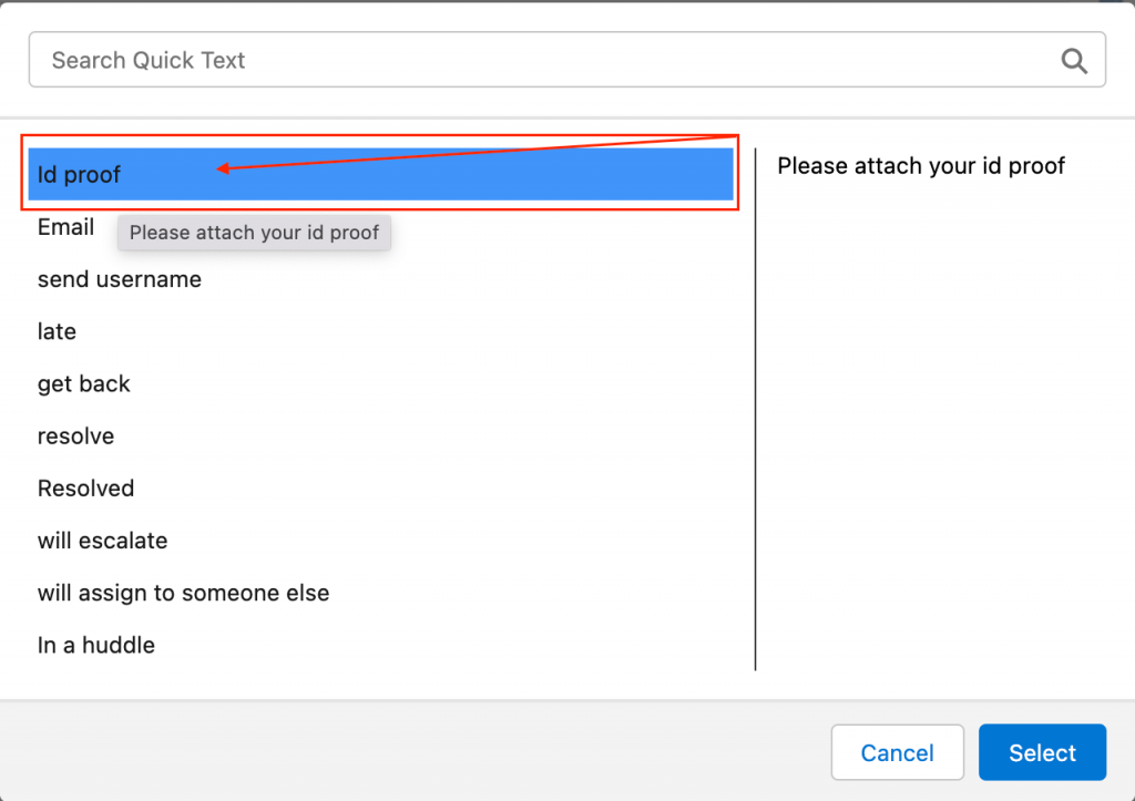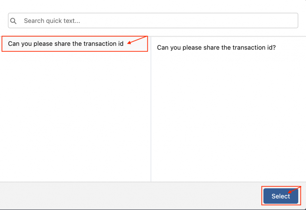 Select the desired Quick Text, it will appear in the input text box for any further editing or can be sent directly.