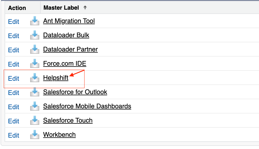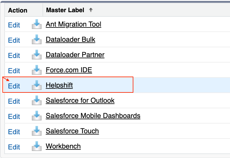 From here, click the name ‘Helpshift’ in the list of apps to get to the Connected App Details page.