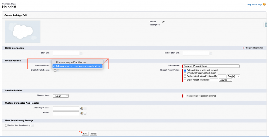 On the page that appears, under OAuth policies, set the value of ‘Permitted Users’ to ‘Admin approved users are pre-authorized’ then click ‘Save’ at the bottom of the page.