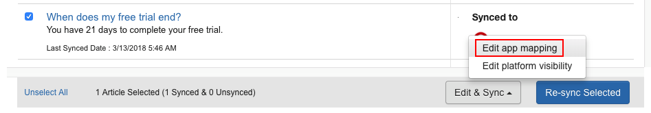2. Once you’ve selected all the FAQs you wish to sync, click the ‘Edit & Sync’ button at the bottom, then select ‘Edit app mapping’ in the drop-down that appears