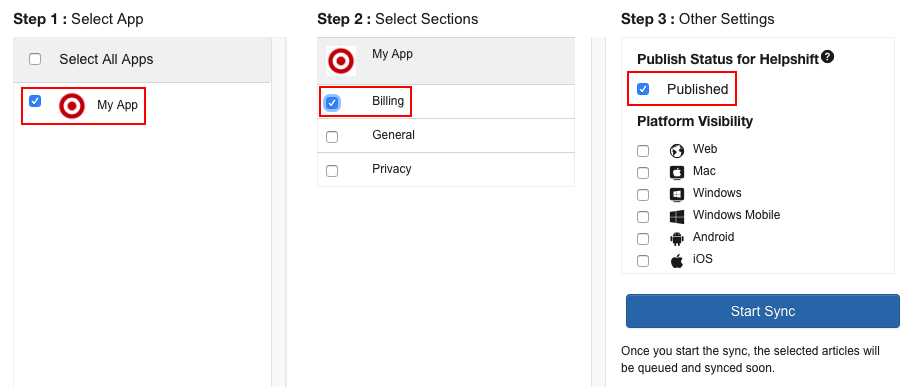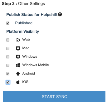 Click the ‘Start Sync’ button. The new FAQs and Sections will become available immediately.