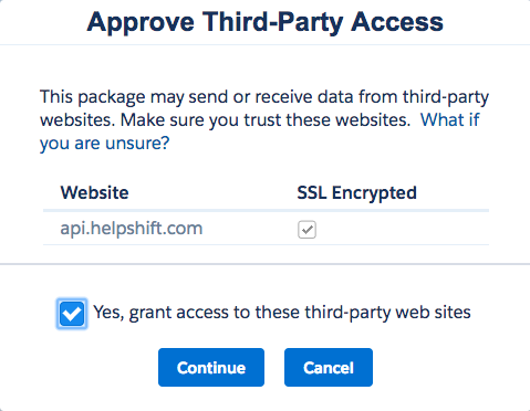 Finally, a pop-up will appear prompting you to approve Third-Party Access. This allows Salesforce to communicate with Helpshift API’s. Check the permissions box and click ‘Continue’ to complete this step.