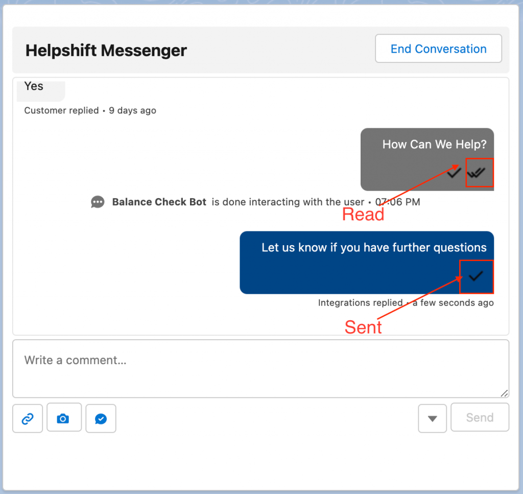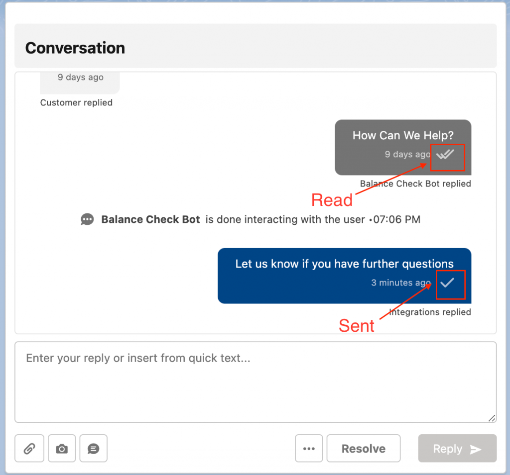 Once the bot is done interacting with the user, the input text box will be shown again for the Agent to continue the conversation. The Messenger will show Bot and Automation messages differently from Agent messages.