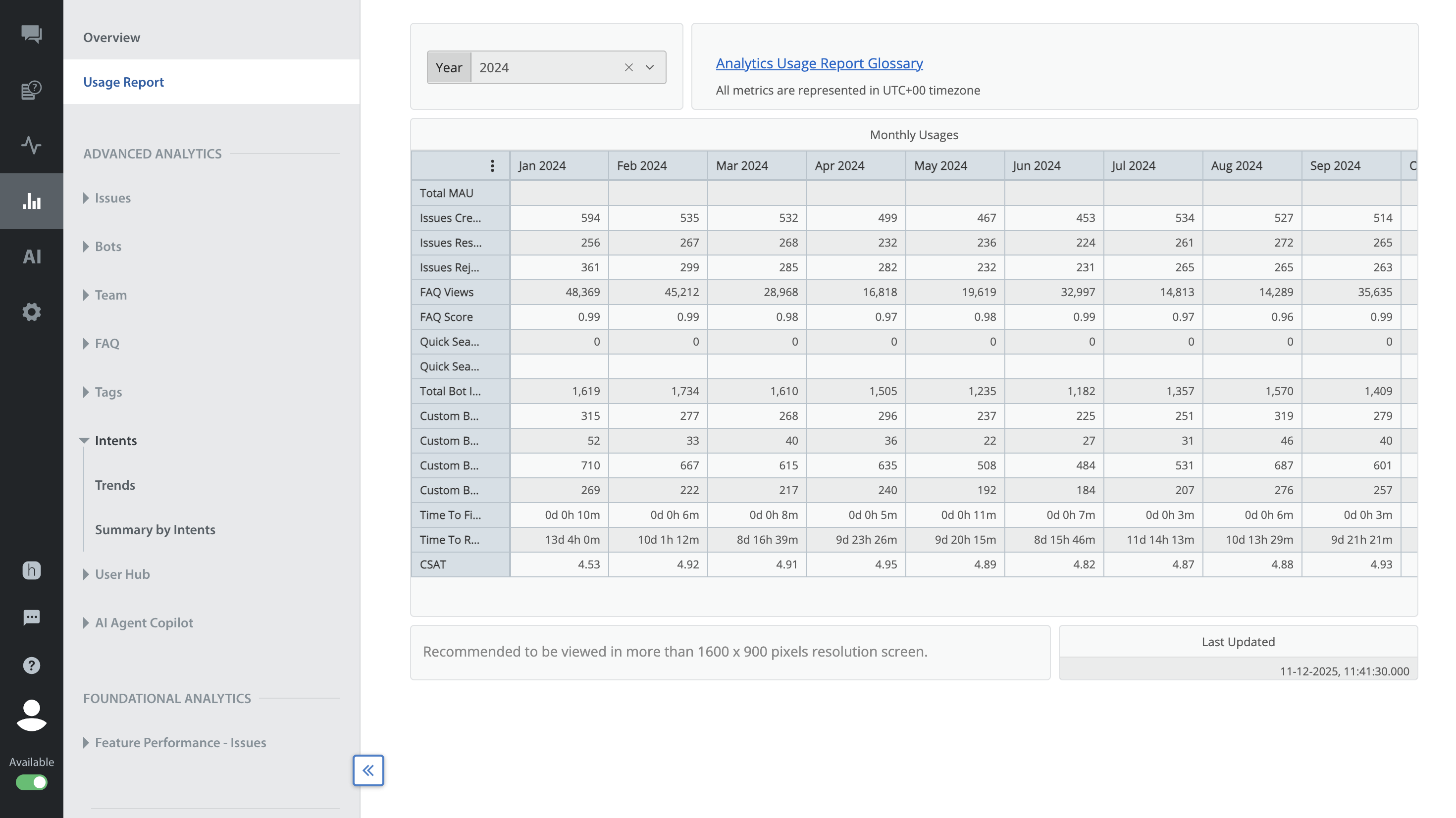 | Custom bots - Issues Resolved | Number of issues resolved by Custom Bots. |