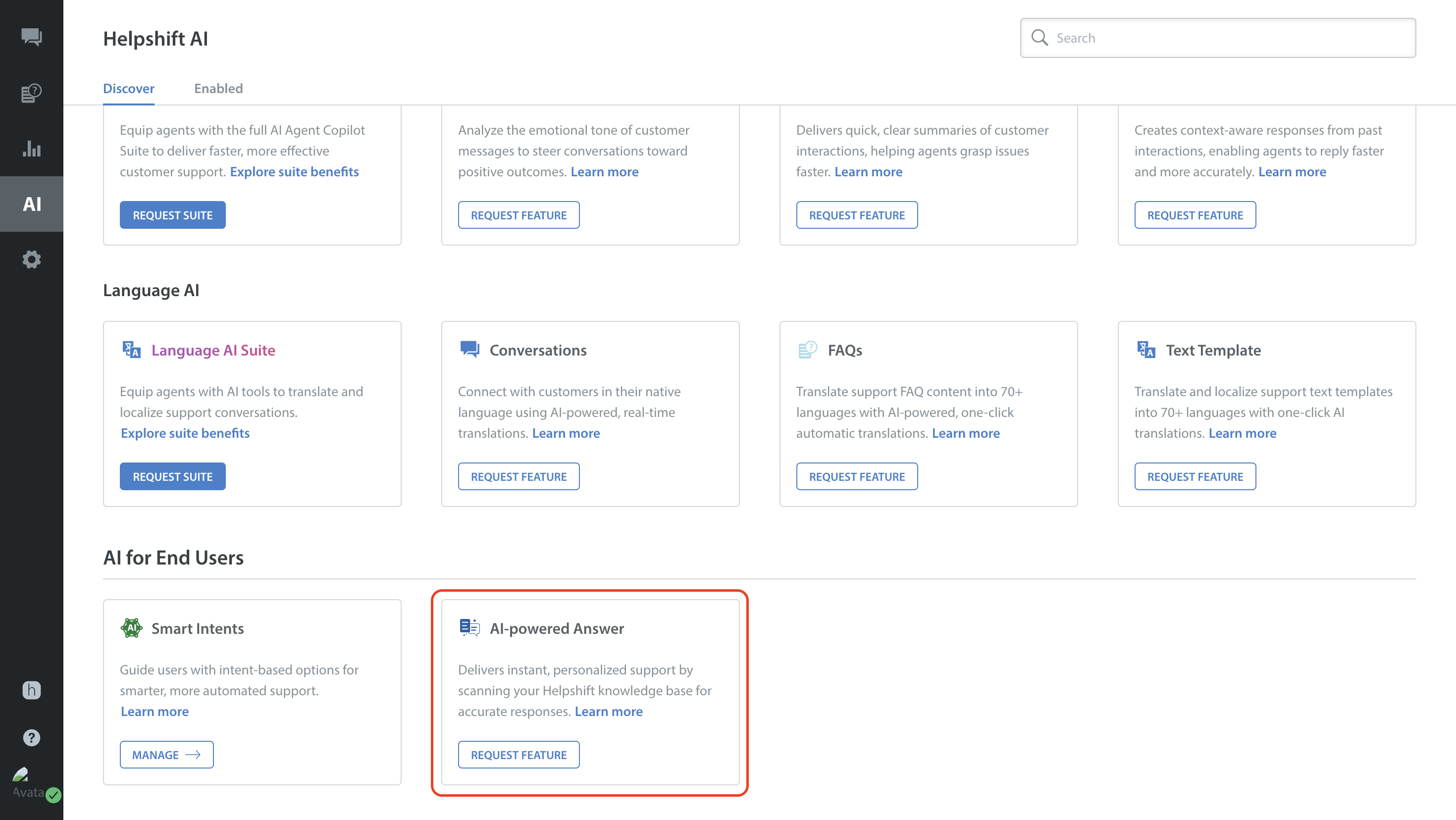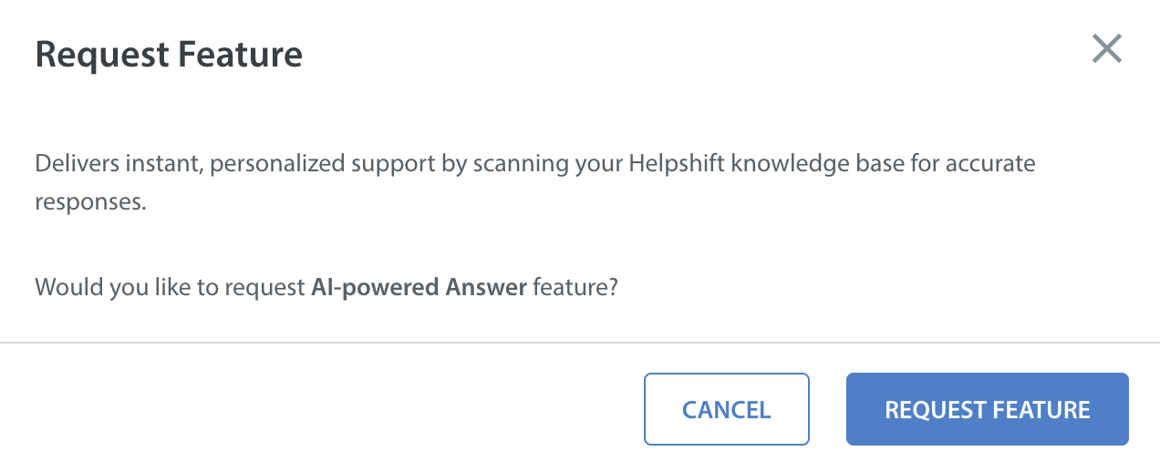 - Click REQUEST FEATURE under AI-powered Answer card of AI for End Users.