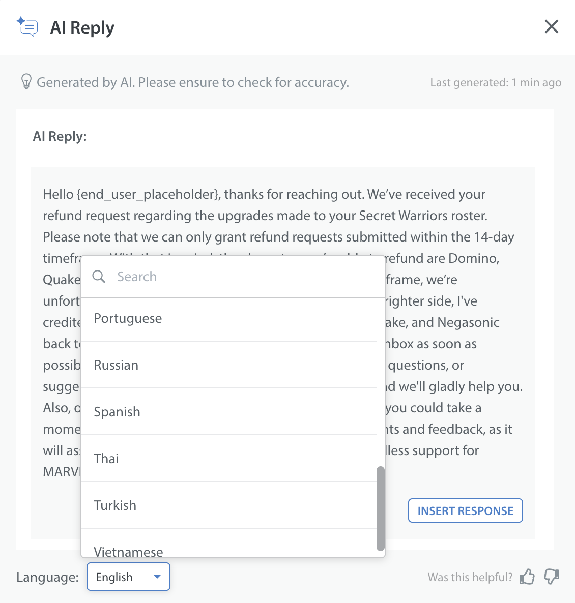 • When the selected language is changed, the response will be regenerated in the chosen language. If the issue language is not supported, the response will be generated in English.