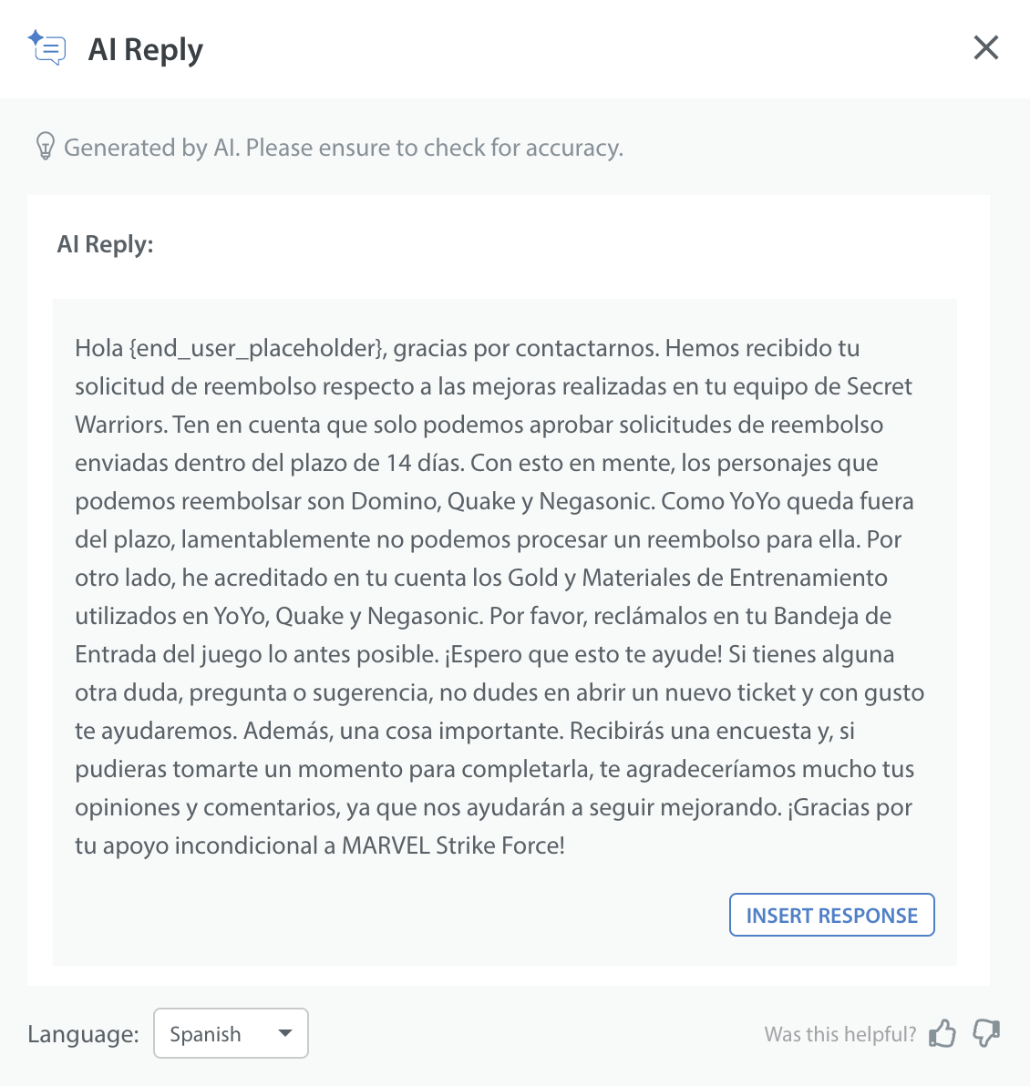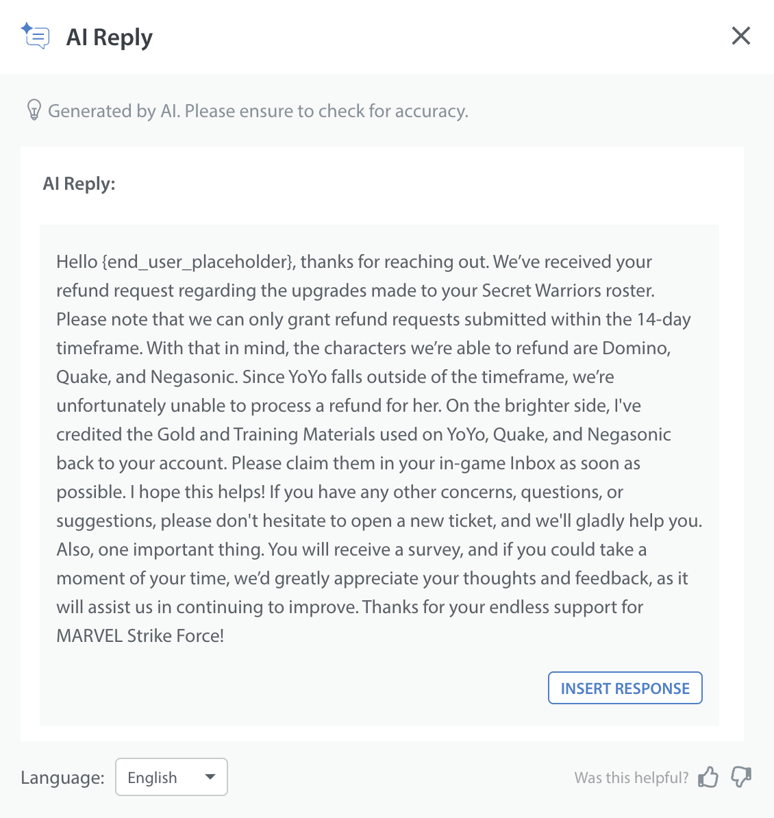 6. Click INSERT RESPONSE to insert the response to the text input area. You can send it as-is or make any changes before sending it.