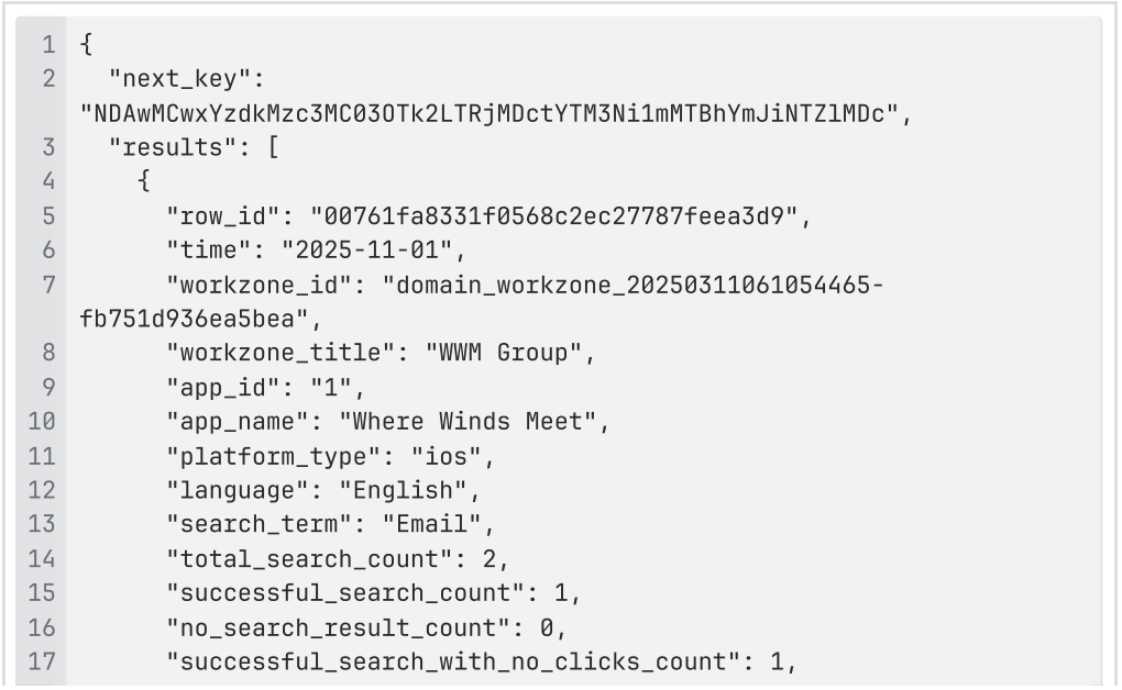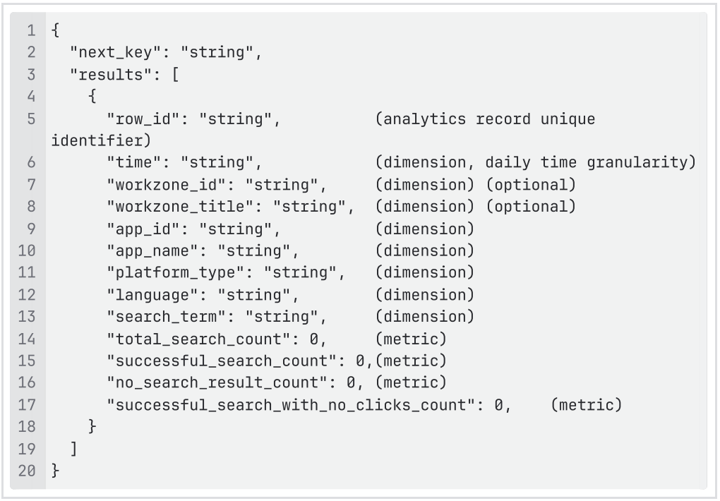 | aggregation | Aggregation level of the metrics (optional) Option: workzone_id, to group the analytics records further by workzone ID for App level permission enabled domains. Adds another dimension to the (app_id + language + search_term + date) aggregation, splitting the data further at workzone-level. |