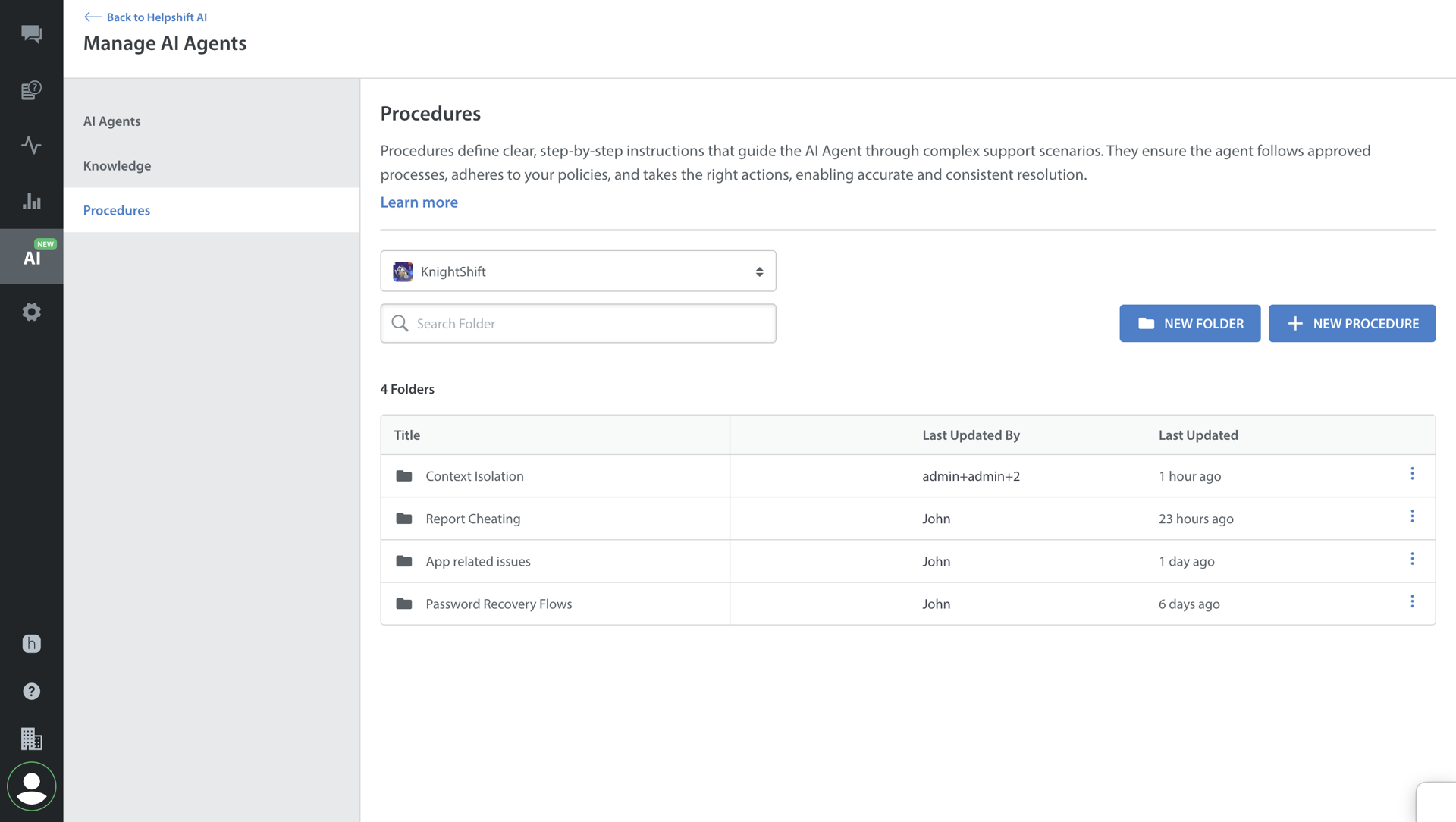 Procedures are created at the App level, since different Apps may handle the same use case differently. For example, the steps to 'Report a Bug' in one App may differ from those in another App.