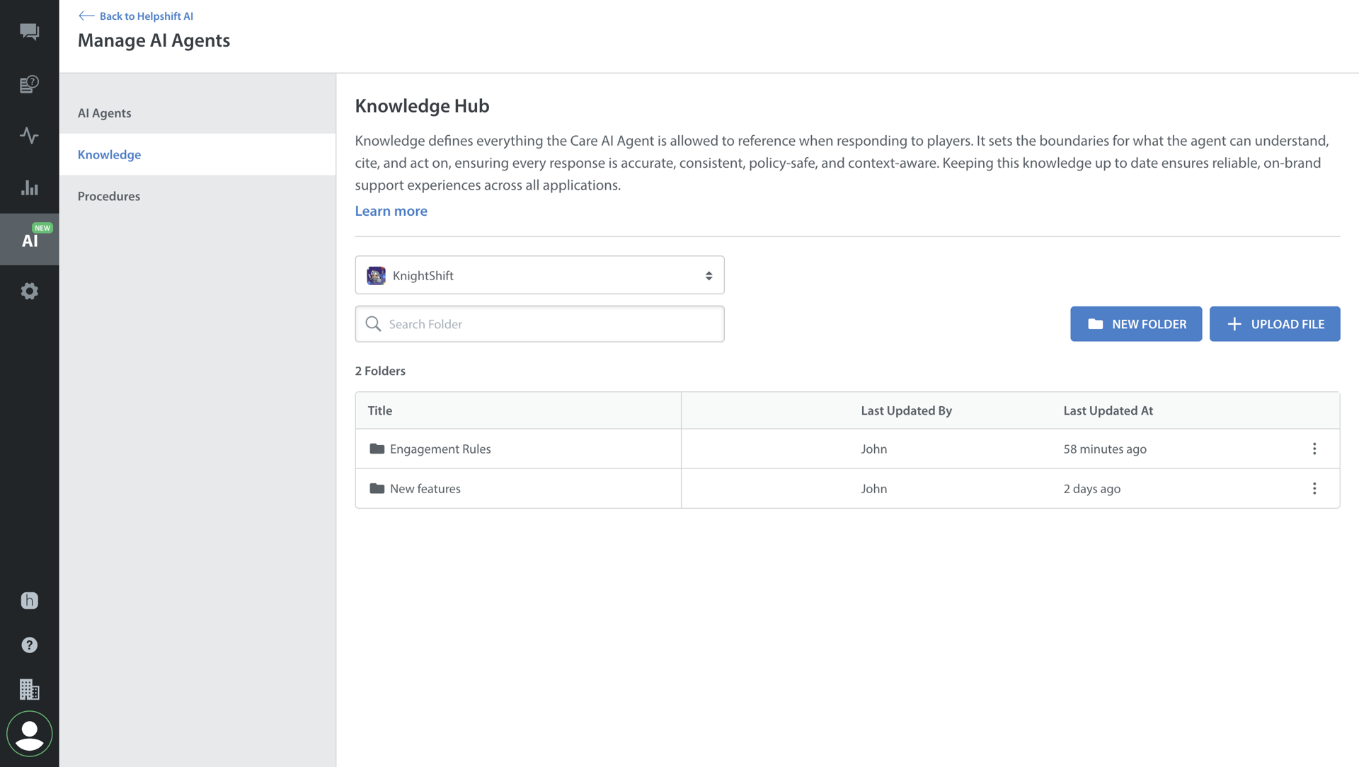 The Knowledge module is the central repository for all knowledge sources your Care AI Agent can reference. You can upload files, organize them into folders, and manage knowledge sources.