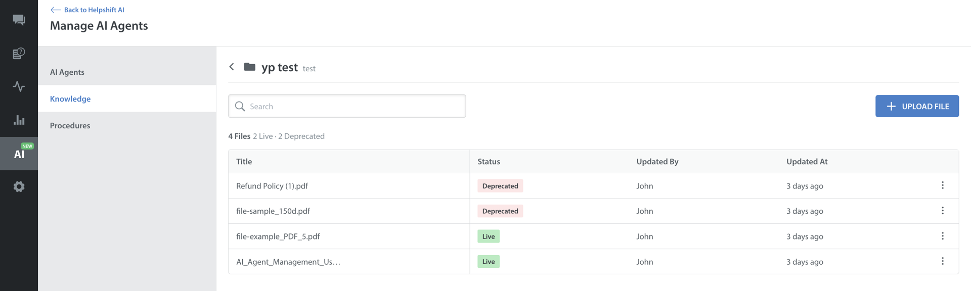 - Folders help organize knowledge into logical groups (e.g., Refund Policies, Technical Issues).