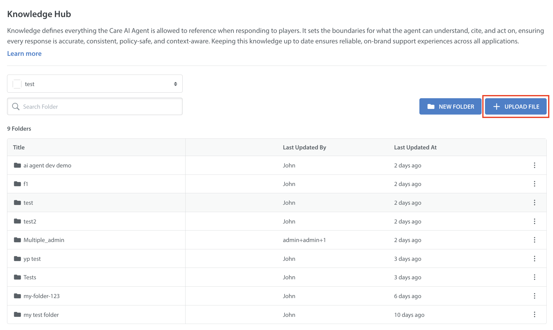 - Care AI Agents are mapped to knowledge at the Folder level.