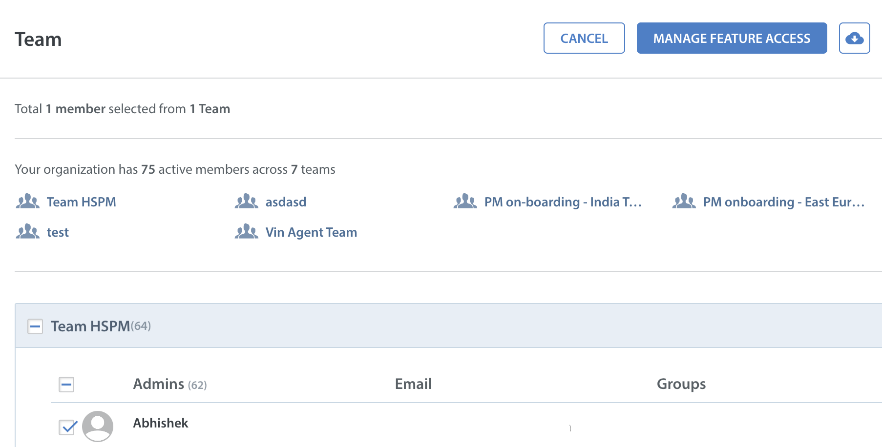 - Select the team checkbox next to the team member's name for whom you want to make changes and click MANAGE FEATURE ACCESS option.