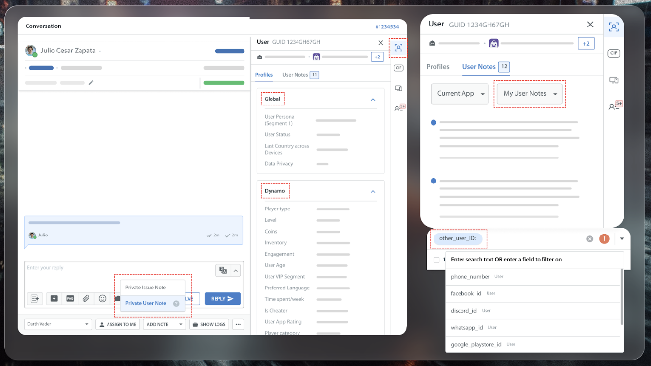 With a centralized user profile that includes IDs, custom fields, notes, tags, and user panels, teams can recognize users across platforms, maintain continuity, and deliver truly contextual support.