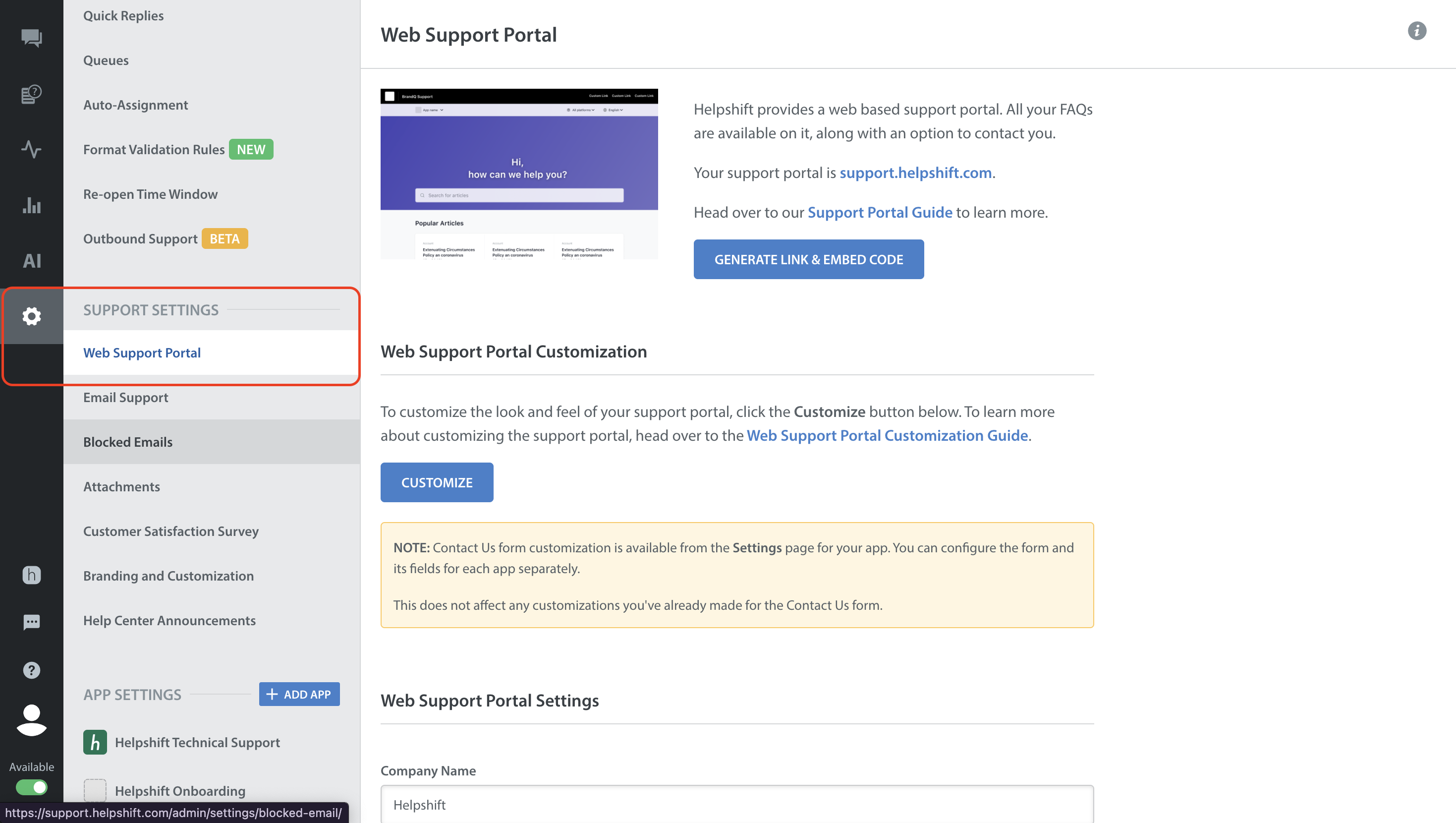 - In the navigation pane, scroll to the SUPPORT SETTINGS area, and then click Web Support Portal.