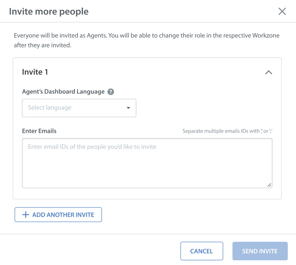 Note: This field to invite your agents in their preferred language is visible only if the multi-language capability for the admin dashboard is enabled (currently supports English and Japanese). If it is disabled, the field value will be set to the English language by default. To learn more, refer to Supported Languages for the Helpshift Dashboard - Enter the email addresses for colleagues who should receive invitations to join your Helpshift instance as agents.