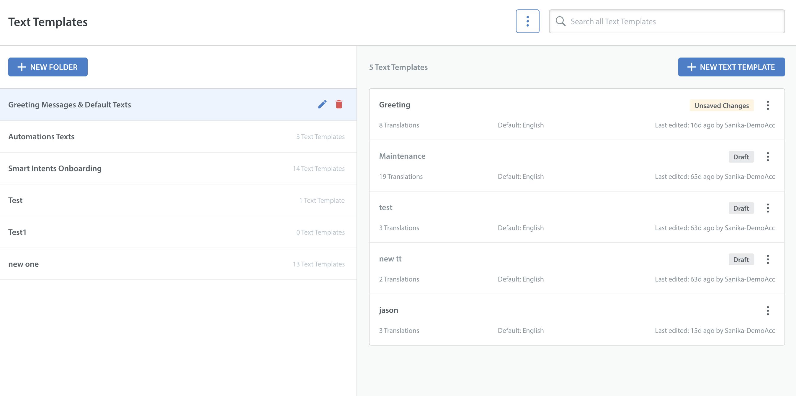 The Text Templates page opens. It lists your brand’s defined folders and text templates.