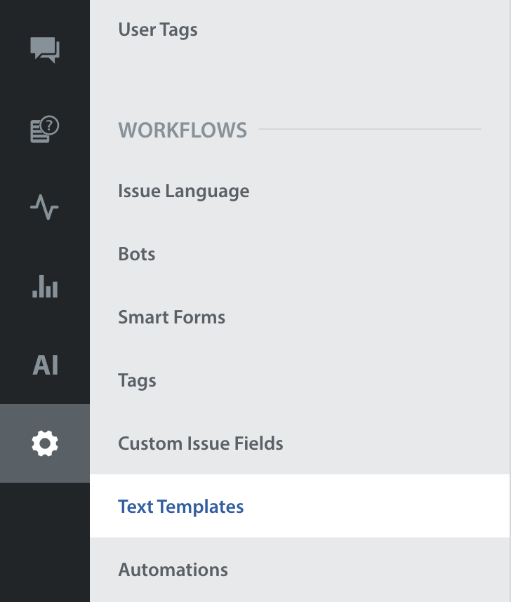 Click Settings on the Helpshift toolbar, and then click Text Templates in the Workflows area.