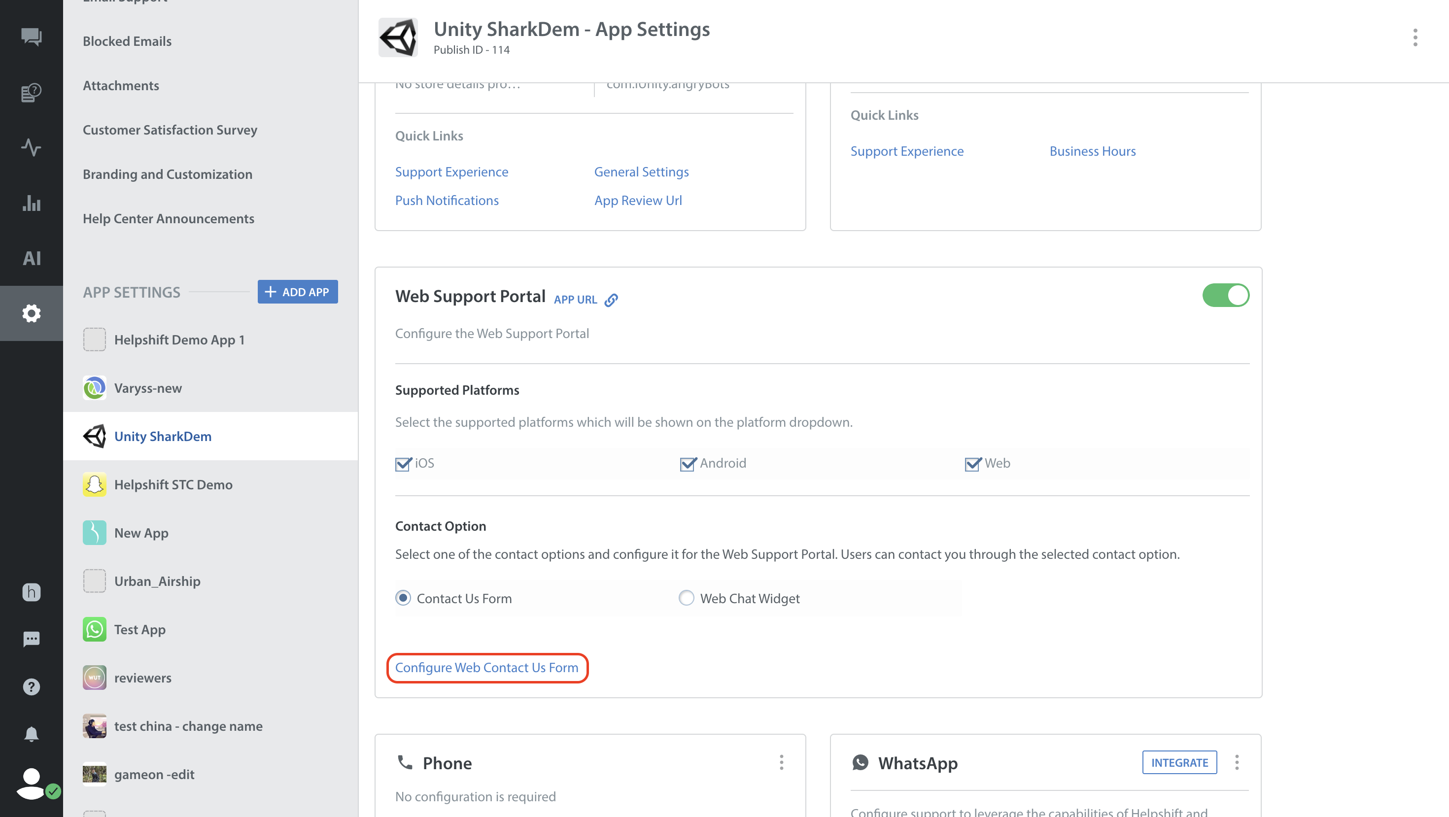- On the Web Support Portal card, click Configure Web Contact Us Form.
