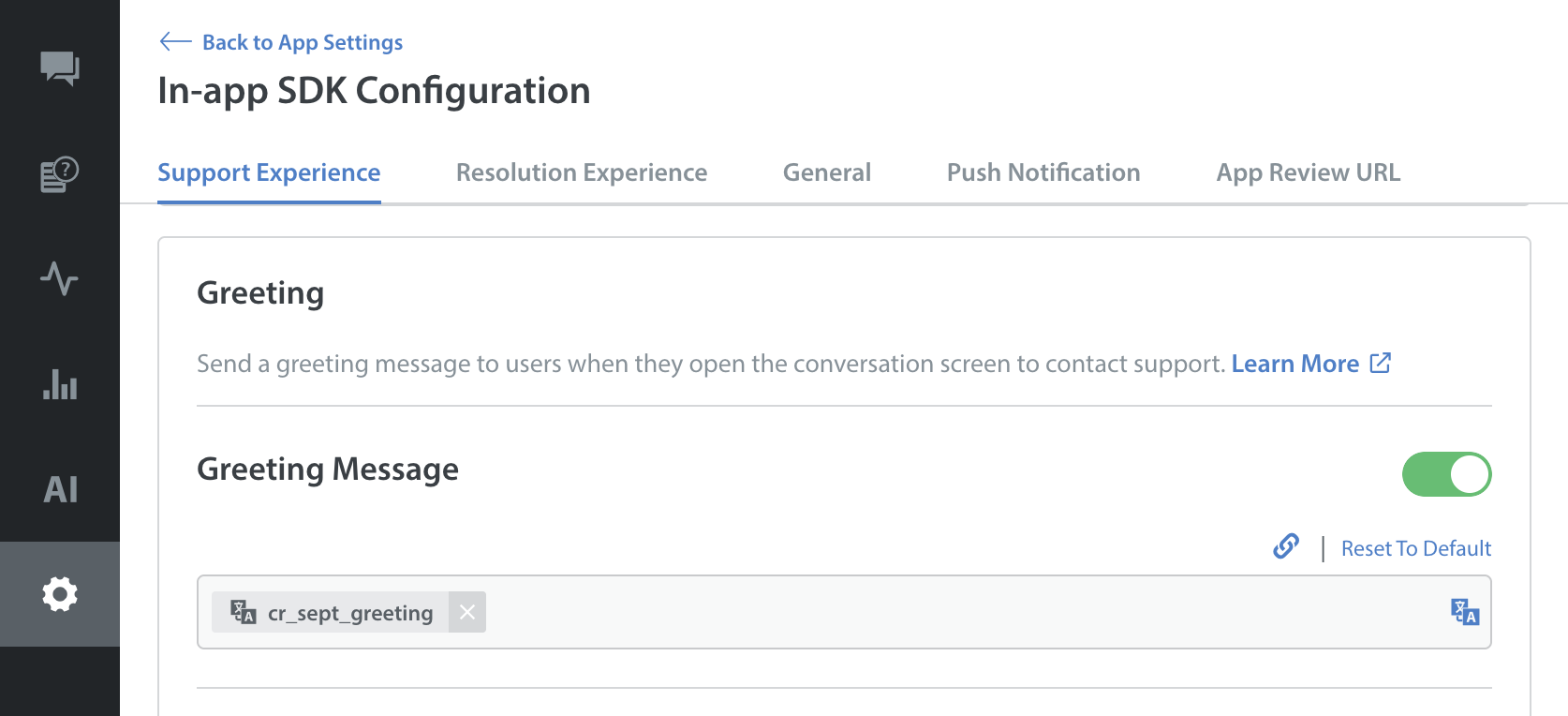 We highly recommend testing how your greeting message appears in different languages (and how it interacts with your other workflow settings) by creating a test Helpshift app and integrating it with a test version of your app.