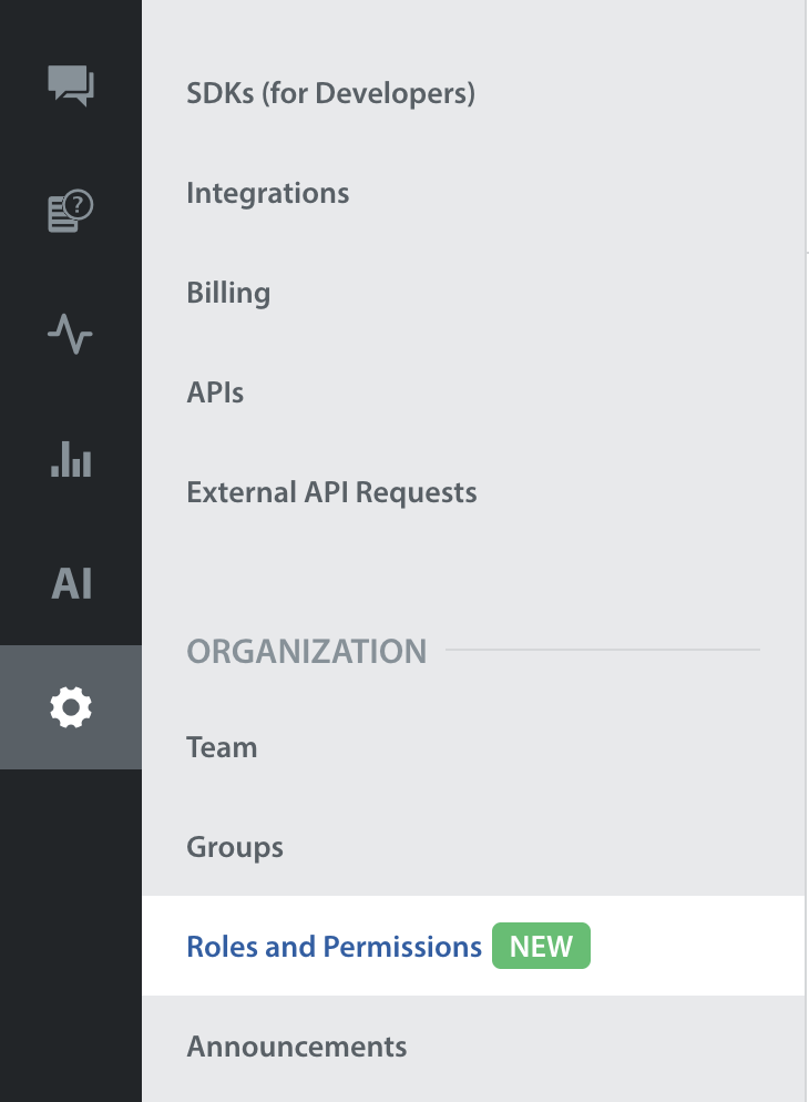 - Click Settings on the Helpshift toolbar, and then click Roles and Permissions in the Organization area.