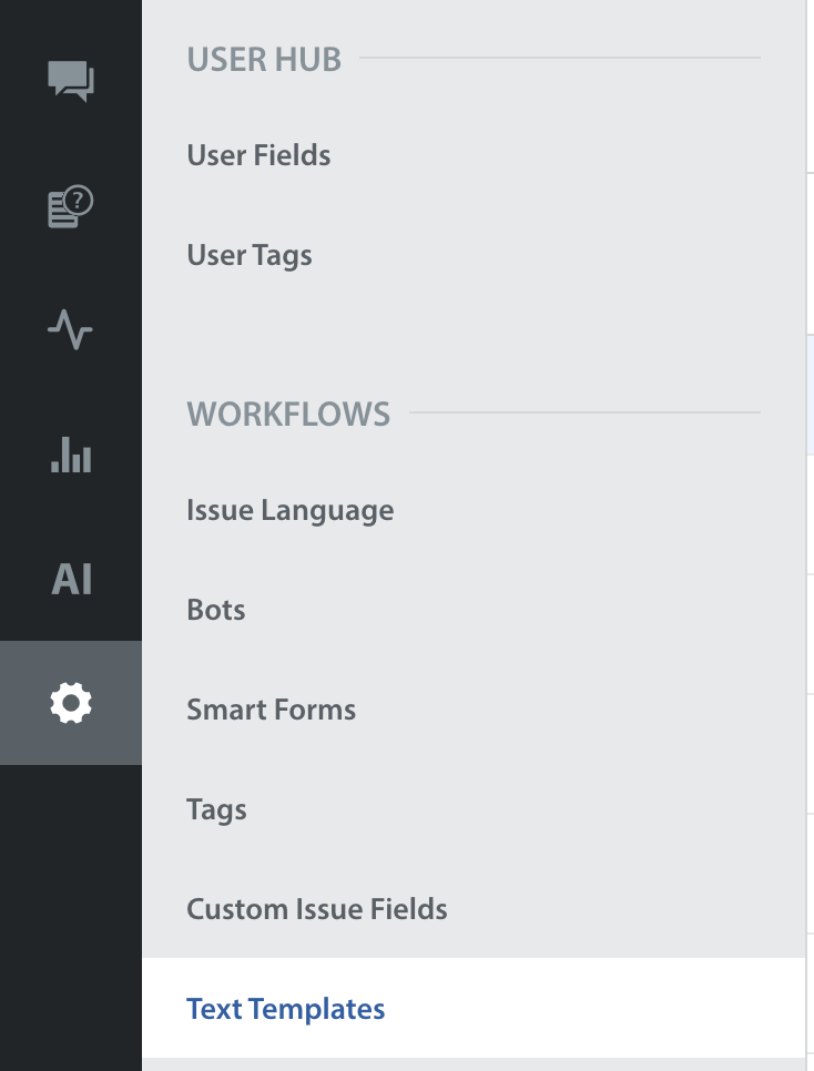 - Naviagate to Settings on the Helpshift toolbar, and then click Text Templates in the Workflows area.