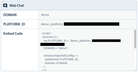 Your domain, platform_ID, and embed code (the JavaScript snippet with your domain and platform ID prepopulated) are listed in this area.