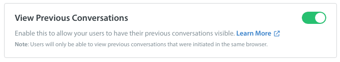 At the bottom of the page, the View Previous Conversations toggle can be enabled to allow your end-users to see their past conversations on Web Chat. To learn about how this works, see How do I allow my end users to see past conversations?