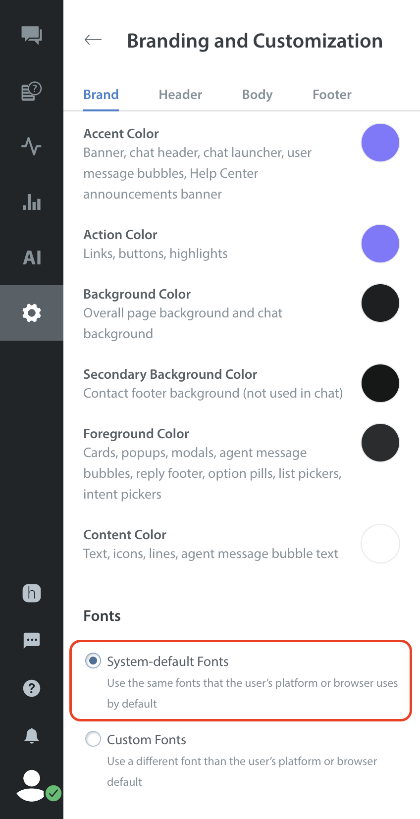 - The saved ‘Content Color‘ applies to message text, icons, lines, and agent message bubble text.