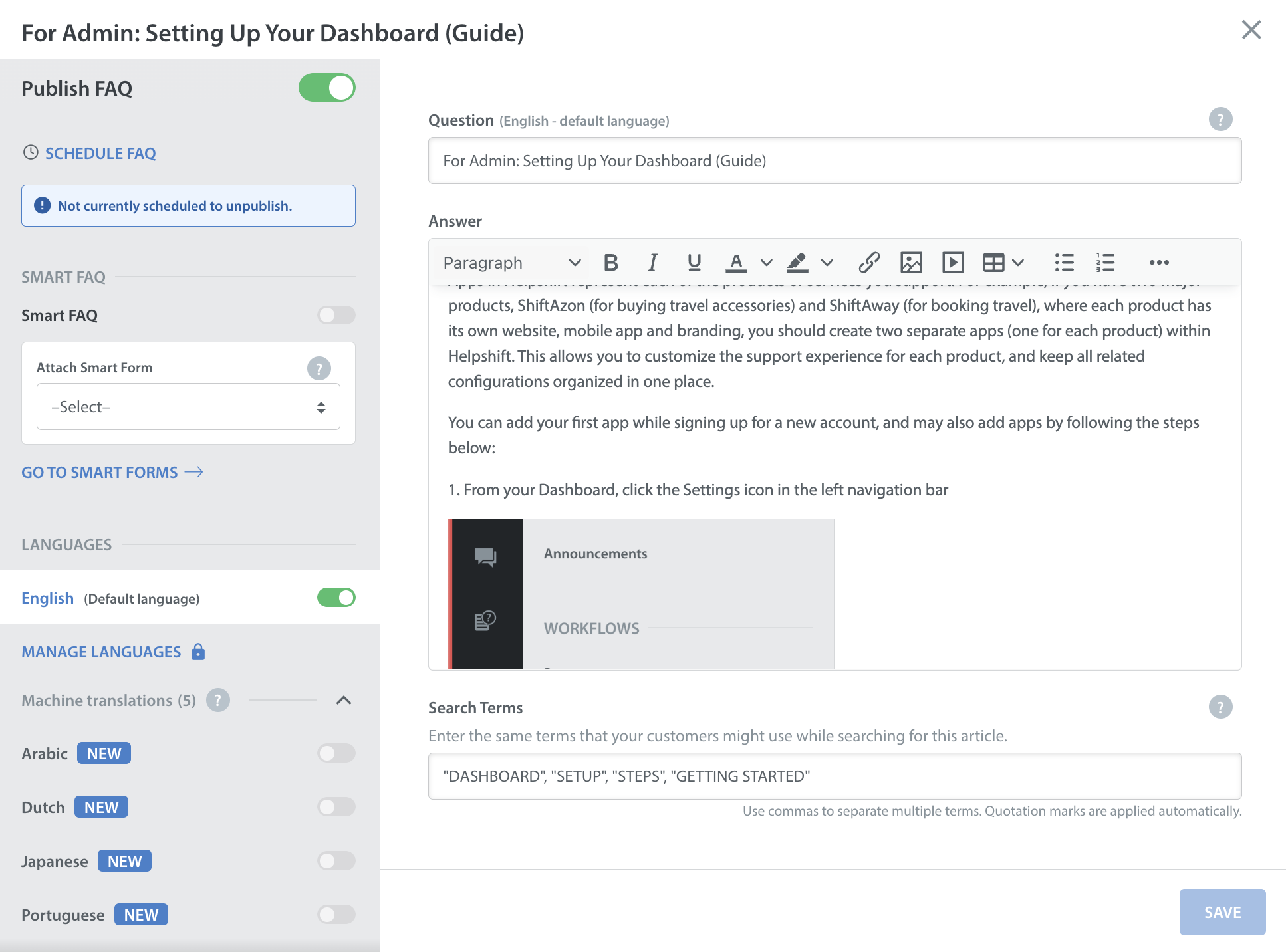 A pop-up will appear where you can add the question, answer, and keywords for the article. Keywords allow your users to find your FAQs easily via common search terms.