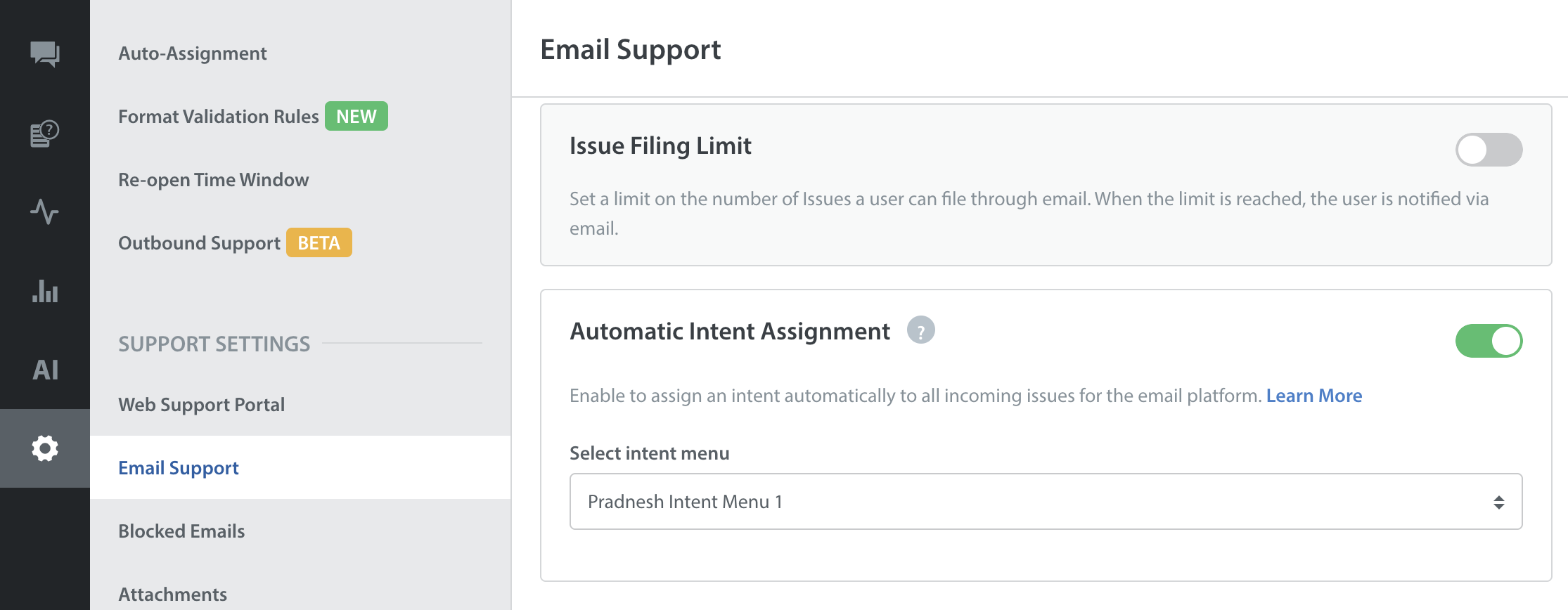 For Web, Email, and SMS you can go to below given respective sections and enable/disable Automatic Intent Assignment and update the intent menu: