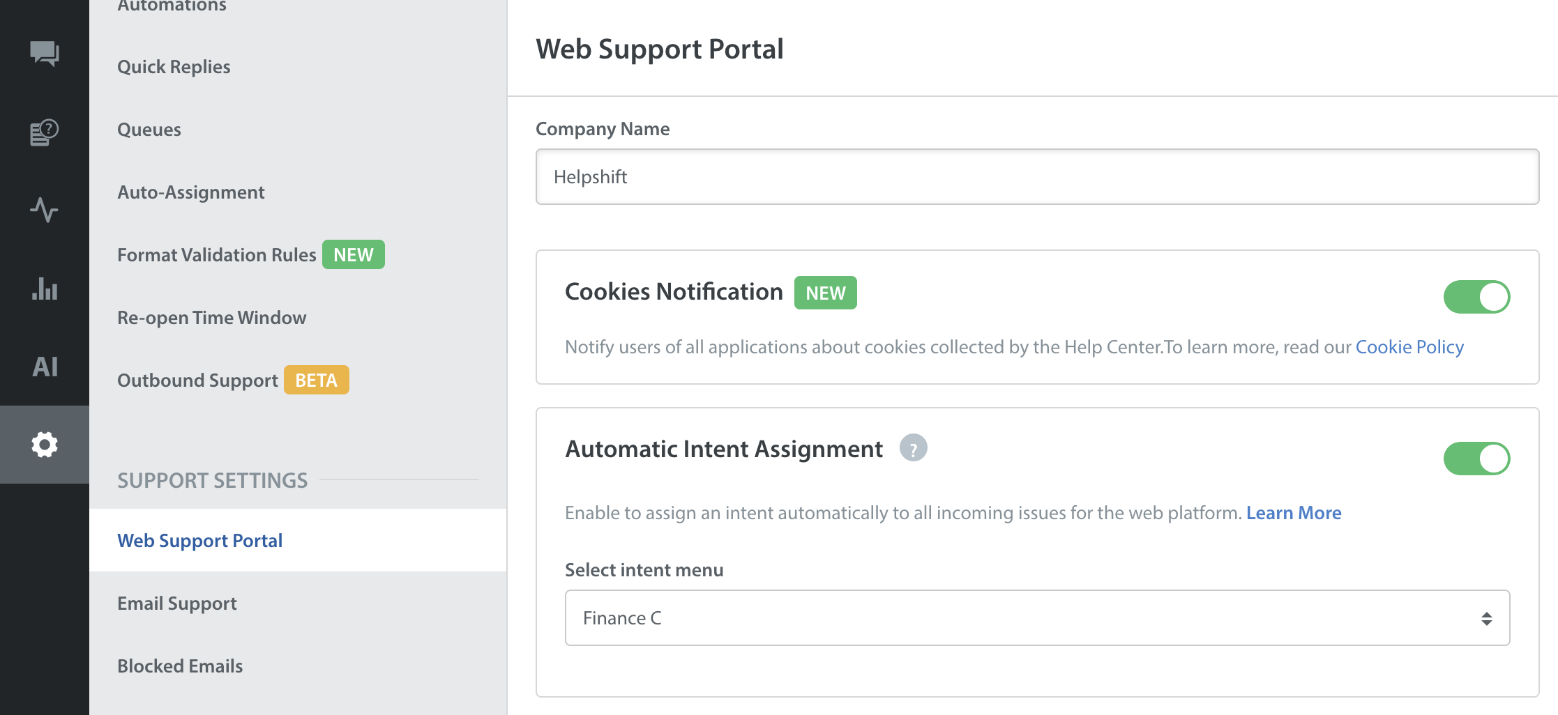 - On the Helpshift toolbar, click Settings.