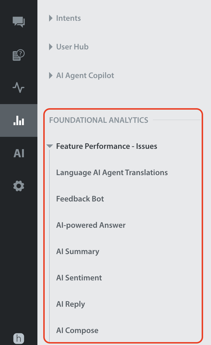 The AI Compose Analytics report is available under the “Feature Performance - Issues” group in the “Foundational Analytics” section.