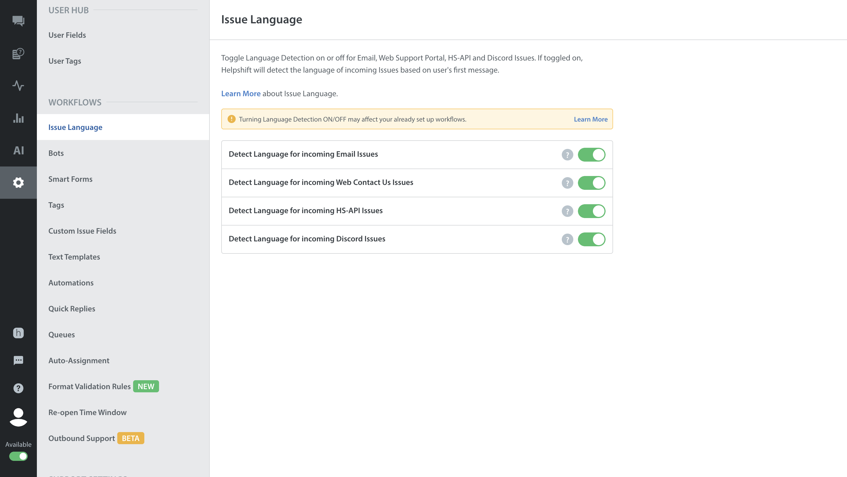 - Once enabled, Helpshift will detect the language of incoming issues based on the user’s first message.
