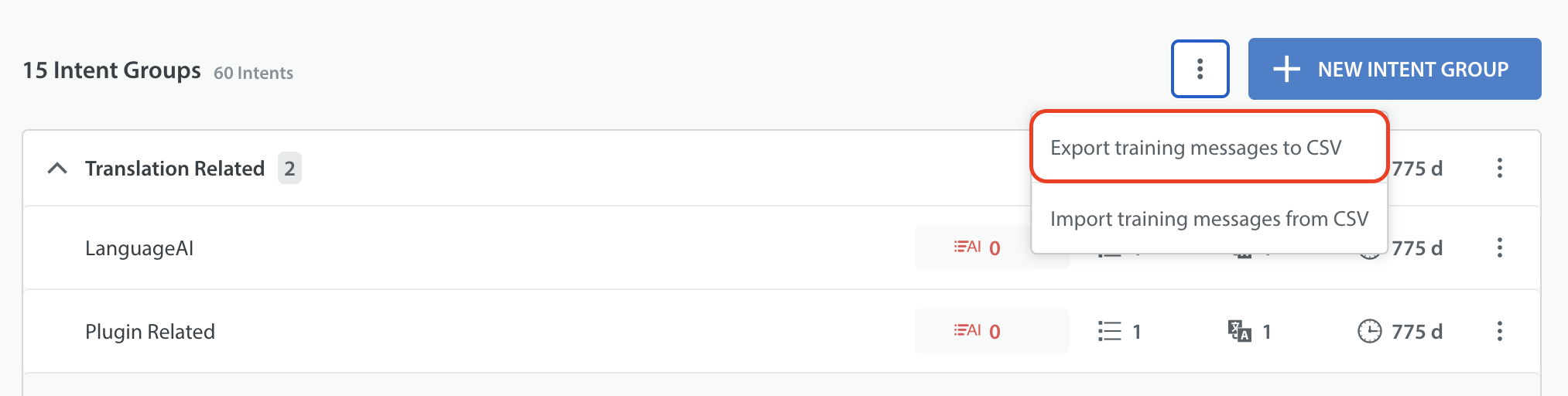 - Click the More Options button (⋮) near to the + NEW INTENT GROUP button.