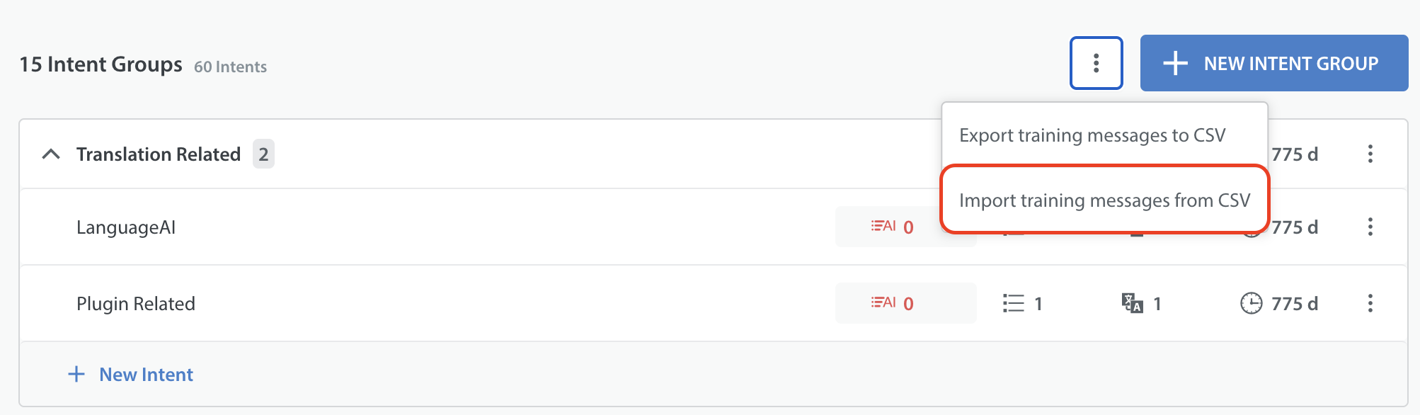 - Near the top of the page, next to the + NEW INTENT GROUP button, click the More Options button (