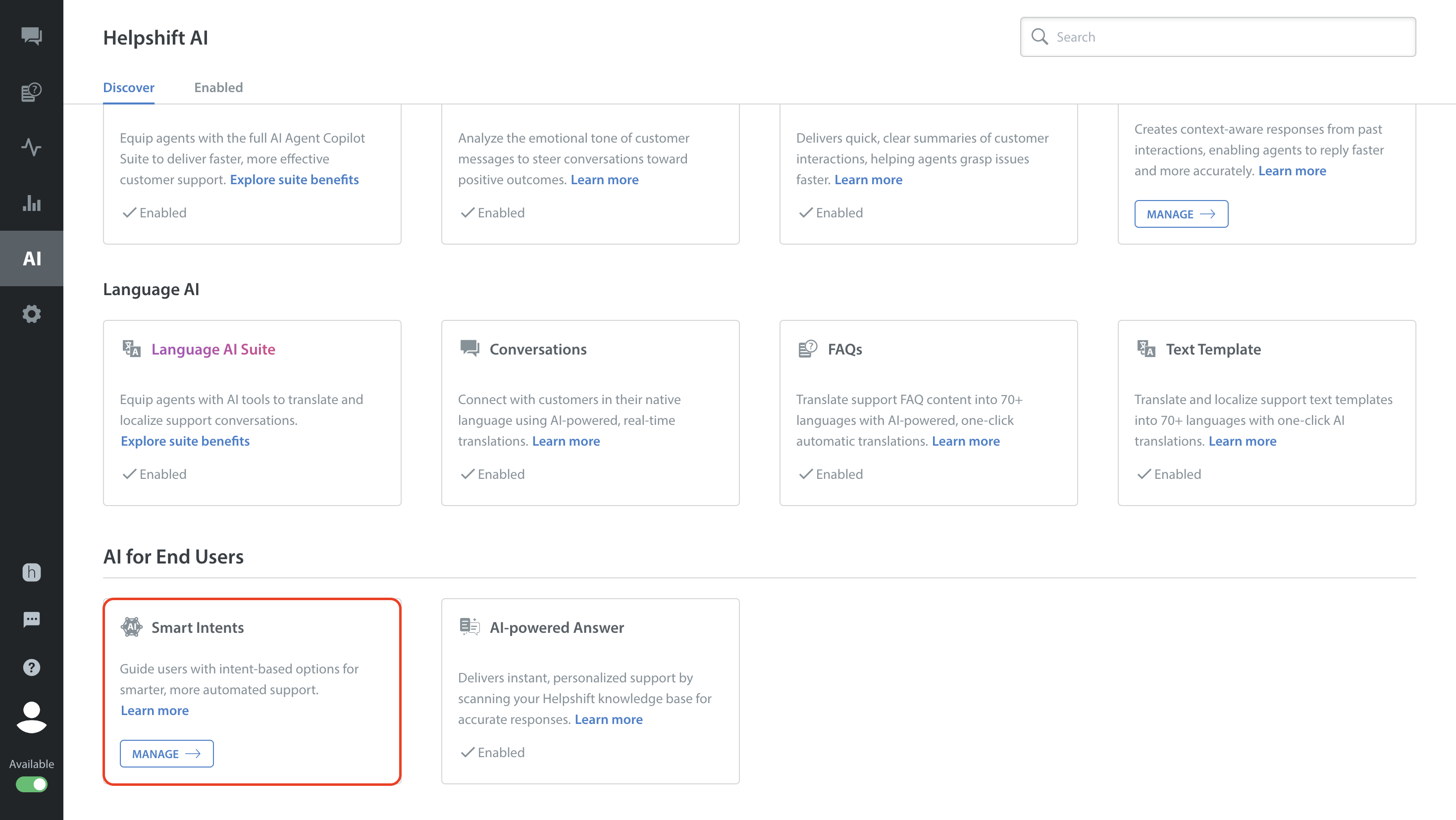 - From Helpshift AI dashboard, click MANAGE ➔ on smart intent card.