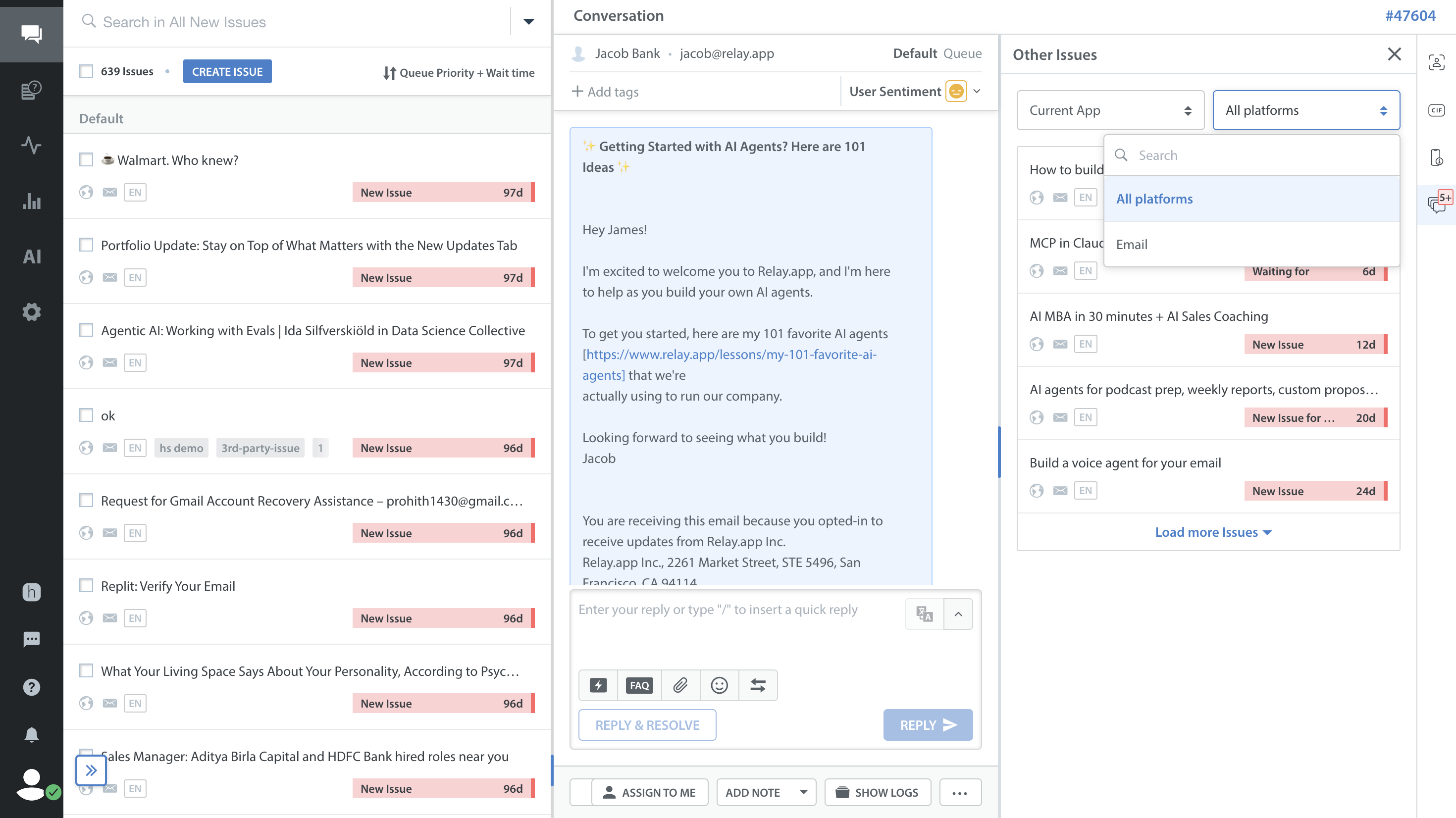 - Platforms: The tab also lets you filter issues based on the user's platforms, such as Email, Web, iOS, Android, Web Chat, Discord, and WhatsApp Messenger, SMS. You can also choose “All Platforms” to view issues across all platforms.