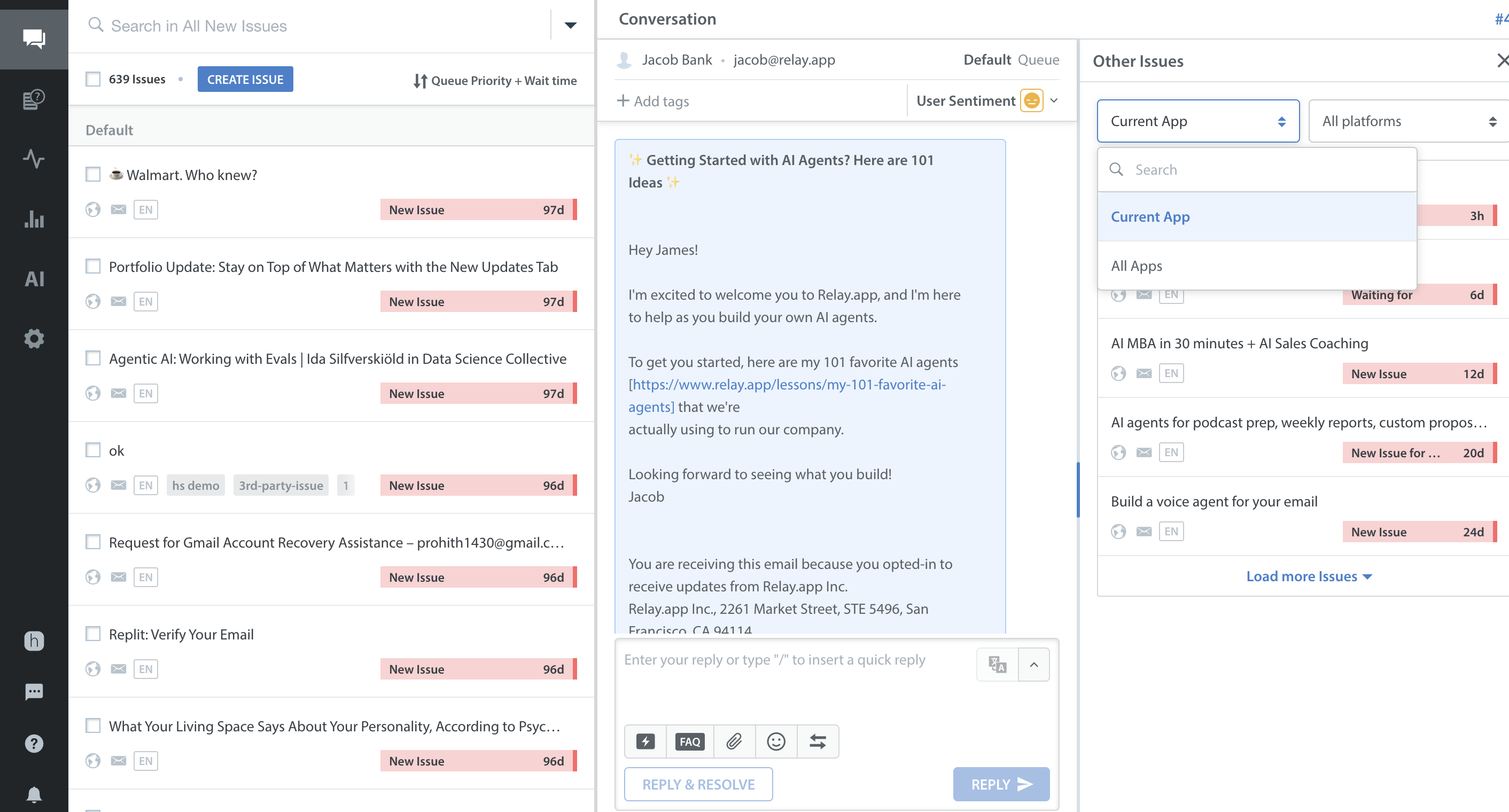 - Apps: The Current App is the default option based on the issue app. This is particularly helpful when a user interacts with multiple apps from the same company. You can view issues across All Apps.