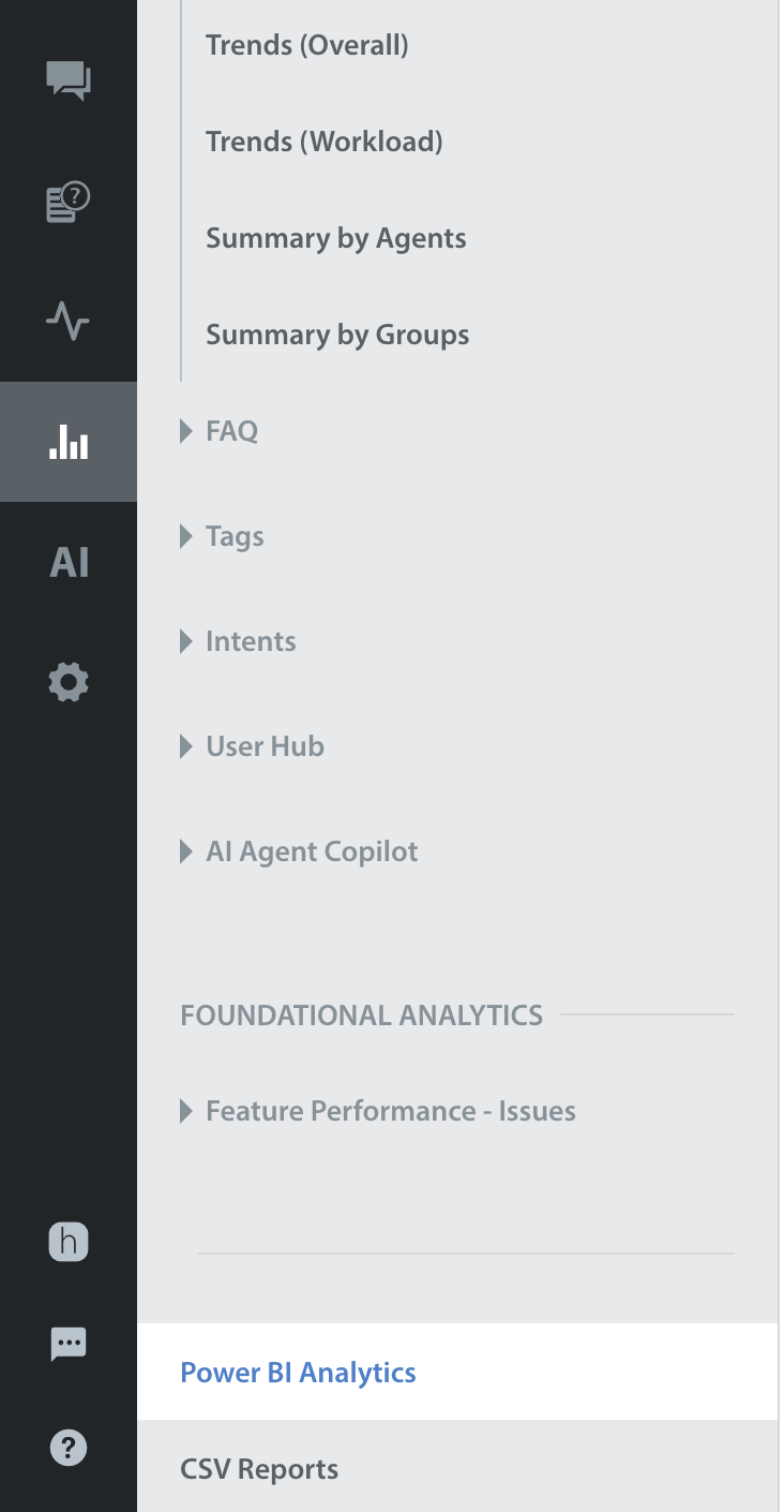 Once your Account Manager has activated Power BI in your Helpshift Dashboard, you will see a new ‘Power BI Analytics’ section under the Analytics tab.