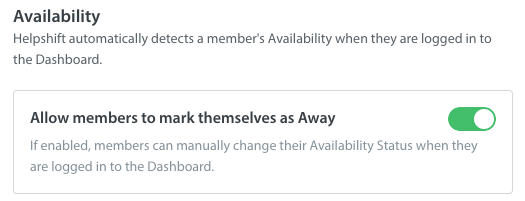 The Availability toggle is available at the top of this page. Toggle ‘’Allow members to mark themselves as Away’ to ON.
